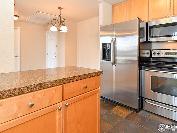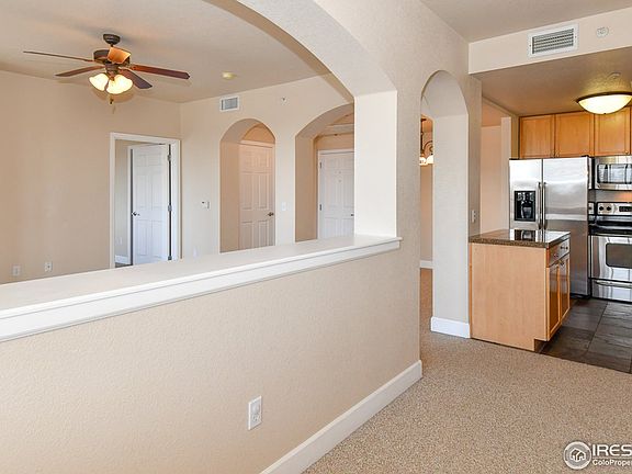 Beautiful, top-floor, corner unit features two bedrooms and two full bathrooms plus a bonus office nook and mountain views; upgrades include slate floors, granite counter tops throughout, and stainless steel kitchen appliances; elevator access; underground, climate-controlled parking plus lock-off storage unit; on-site gym, community room, and interior courtyards with fountains; Spanish-inspired architecture; secure building near the Meadows shopping plaza, library, restaurants, and the Flatirons Athletic Club.