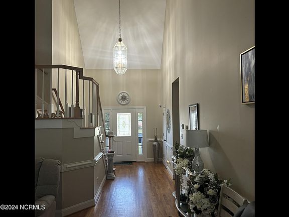 Welcome Home! This well-maintained, stunning home located in the desirable Dewfield Community in Wilson is ready for you. It features a 5-bedroom, 2.5 Bathroom. This home boasts hardwood floors though the living room. The Primary Owner's Suite is on the 1st floor with spacious walk-in closets, walk in shower and a jetted tub in the primary. The living space has beautiful cathedral ceilings and a beautiful fireplace. The Formal Dining Room is right off of the Kitchen which features a center island and stainless-steel appliances. This home has a full guest bathroom upstairs and a hallway bathroom on the primary floor.