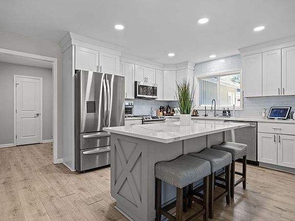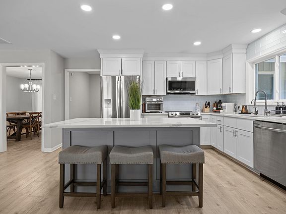 Soaring ceilingsCustom-designed kitchenLight-filled homeNew roofSleek glass tile backsplashQuartz countertopsDual closets