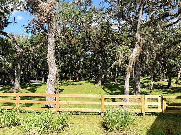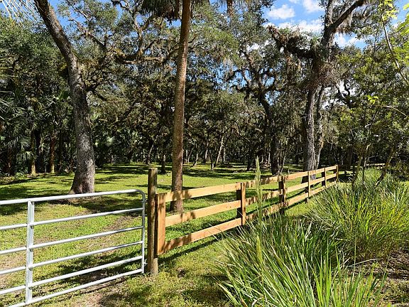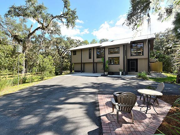Exceptional craftsmanship in this unique and secluded home, located in the gated community of Hidden River. The 18+ acre double lot affords privacy, abundant and diverse species of birds and wildlife, wonderful trails for the peaceful enjoyment of old Florida and you are welcome to bring your horses. Built on pilings, the raised main living area has an open design including a 24x20 living room with corner fireplace, sun room, powder room, breakfast area, galley style kitchen with solid wood cabinets, granite and cypress tops, 5-burner gas stove with 2 ovens. A light and bright master suite with tub and shower, walk-in closet and private deck open looking at the tropical landscape beyond. A finished sun room, laundry and second bedroom/bath complete the interior space. Other features of note are: newly paved driveway, sun shades, alarm system, auto generator, water softener, interior fire sprinkler and hurricane storm panels. 2 car garage, plus air conditioned storage room. Hidden River is an Equestrian and Aviation community with fitness path, picnic tables, 4-wheeler approved and abuts Myakka State Park.