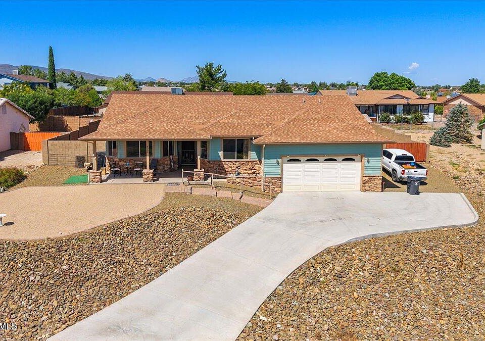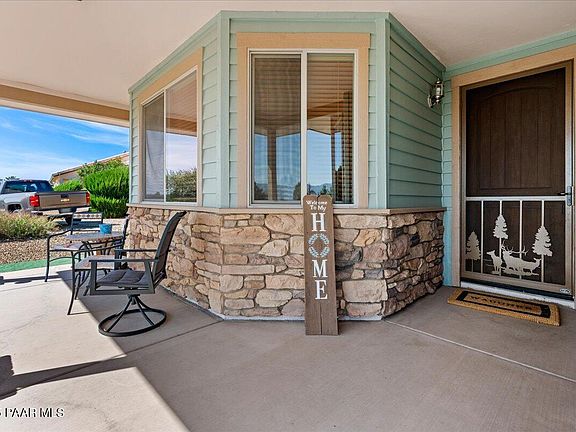 Stunning Views & Custom Comfort in Desirable Prescott Valley Unit 20. This 3-bedroom 2-bath home with a spacious living room features vaulted ceilings, a stone fireplace, and luxury vinyl plank flooring. The chef's kitchen boasts hickory soft-close cabinetry, granite counters, stainless steel appliances, and a center island. The dining area captures stunning sunrise views. The private primary suite offers a luxurious en-suite bath with dual vanities, soaking tub, tiled walk-in shower, and a generous walk-in closet. Two additional guest rooms and a well-appointed guest bath provide space and comfort for all. Enjoy panoramic Mingus Mountain views from this beautifully upgraded custom home. Relax on the covered front porch or entertain in the low-maintenance backyard with a large covered patio with ceiling fans. Oversized 2-car garage, and ample driveway space. Side parking for a trailer, boat, or small RV add extra convenience. A 10x14 powered shed is included.