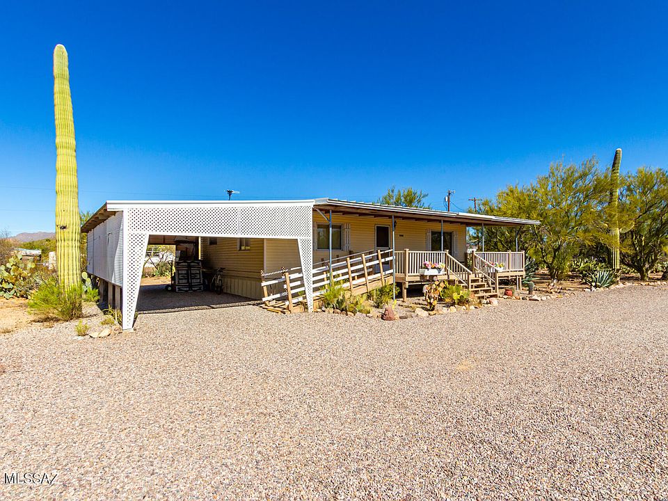 Fantastic manufactured home sits on a HUGE 1.82-acre lot! This private property offers tranquil mountain views and more. A desert landscape, RV gate, & a covered parking space are just the beginning. You'll love the front elevated deck with a ramp, where you can relax while enjoying great views! This home comes furnished and is in immaculate condition. The inviting interior boasts tons of natural light, wood-accent walls, and soft carpet in all the right places. The formal living room is perfect for receiving guests! The eat-in kitchen has elec range and wood cabinetry w/pull-out drawers. Enter the main bedroom to find a full bathroom for added comfort. Let's not forget the attached storage shed & a detached workshop. This gem won't disappoint and is being sold ''AS IS''.