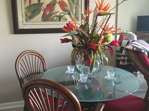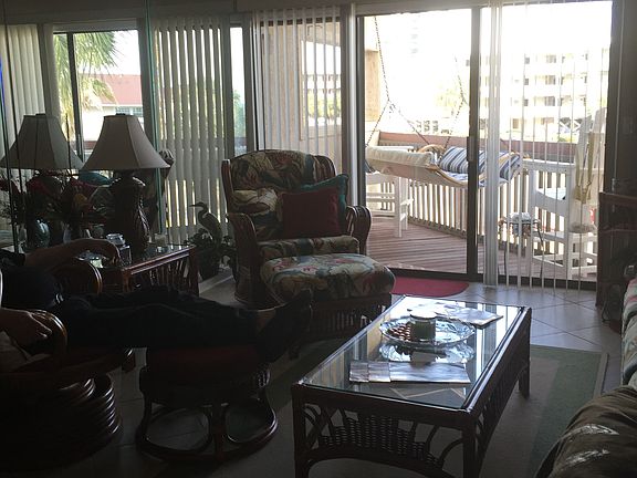 Location, location, location! This condo is in a PRIME location! This "Happy Place" will be your dream come true. The beach access is directly across the street and is only feet away from the water. A lot has been done to this unit to insure it's an excellent choice for you! All the flooring has been replaced throughout the unit with 18 inch ceramic tile. The washer/dryer - stack unit, dishwasher, hot water heater and HVAC (inside and outside) have all been replaced. The unit has Hunter ceiling fans in both bedrooms and in the living area. The furniture in the living and dining area is all matching - Bird of Paradise theme. There are 3 bar stools at the bar which gives extra seating for dining. From the living area there is a nice balcony with a swing and 2 tall PVC beach chairs. This is a great area for relaxing and enjoying time with friends and family. Outside of the master bedroom is a small balcony with one PVC chair - just perfect for some nice quiet alone time. The living area also has a nice flat screen TV and a computer desk and chair. The other TV is in the master bedroom. The kitchen has a custom made pantry that is great for all your "beach snacks" and a place to hide all your goodies! Our "home away from home" has been for family use and has not been on a rental program. Also it has been a non-smoking - no pets allowed unit. This is a must see unit ! Once you enter and feel the beach at your fingertips, you will never want to leave. This is one awesome- ready to move in condition- condo. It will definitely be your Happy Place!