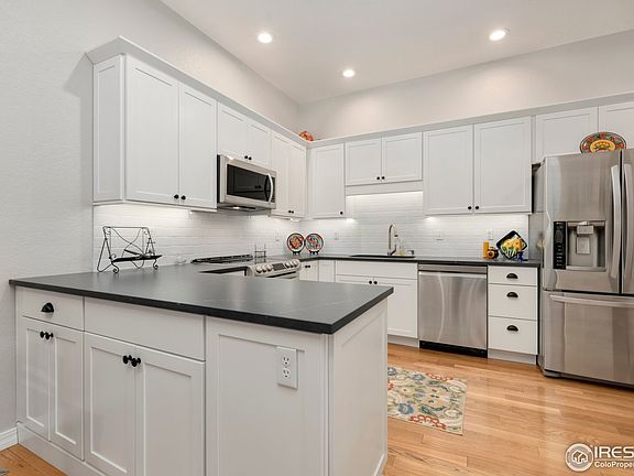 This is a beautiful, updated 2 story townhome in SW Fort Collins. This light-filled unit has 3 bedrooms and 3 bathrooms, and has upgrades including quartz countertops, ample maple cabinets with classy underlighting, hardwood oak flooring, and attractive custom stonework around the gas fireplace. The home includes 2 walk-in closets, a finished basement (1 bd, 1 bath), and a large attached 2 car garage. This is a quiet, interior unit within Arapahoe Farms and is an outstanding home!