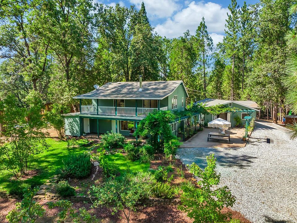 A unique and intriguing property with potential for all your desires! Beautiful and private 10-acre lot with completely updated contemporary style home. Finished garage and workshop, large shop, barn, craft shed and more! Home has beautiful bamboo floors, open concept living, fresh paint from top to bottom inside and out, wonderful, covered deck and patio areas to take in the views and sunsets. The primary bedroom is light and bright with large windows, seating area and patio access. The living area is open and inviting with many windows. Located in the beautiful sought after Meadowbrook neighborhood, 10 minutes from grocery and hardware store and 15 minutes from the American River. Paved country road and freshly graveled driveway lead you to this 10-acre oasis. Set up for horses with a Barn with upstairs storage, large meadow and cleared road around the perimeter of the property. Landscaped yard with water features, flagstone patio, chicken coop and fruit trees. There are opportunities here for multigenerational living and extra income. This is the place to make all your country living dreams come true! Plenty of room and privacy to work from home, create, host and spread out, this property has it all. Tons of opportunity!