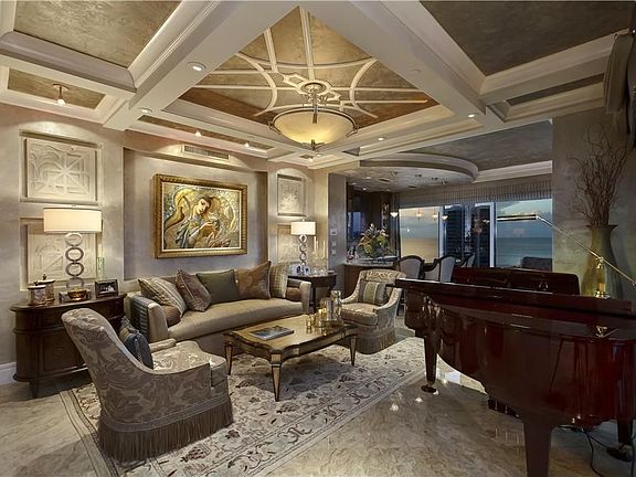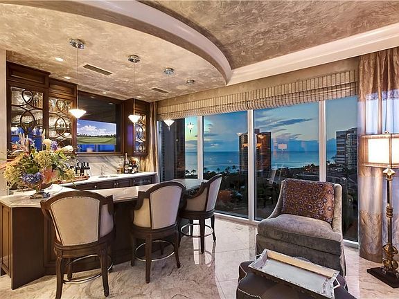 Beachfront luxury exceeds every expectation in this sumptuous estate-size realm on the twelfth floor of Aria, the newest and last condominium to be built along prestigious Park Shore Beach’s Gulf of Mexico coastline. Surrounded by sensational views over the Gulf, Venetian Bay, and the city, this fabulous customized residence is designer appointed by Collins & DuPont with an artful eye and a passion for detail. Luscious Baltic Cream marble, subtly luminous Venetian plaster, and intricate moldings are just a few of the adornments giving warm sophistication to this seductive showplace. Dramatic view-filled terraces expand from the formal entertaining spaces and the casual living areas. Creating privacy for the grand master suite, the two additional bedrooms are placed in a separate wing. Styled and finished to perfection, this is the ultimate Park Shore Beach abode. Location 4501 Gulf Shore Boulevard North, #1205, Naples, Florida. The newest and last beachfront condominium to be built in the desirable Park Shore Beach community of Naples, Aria was created by the visionary Lutgert Companies and designed by award-winning Smith Barnes Santiesteban Architects along with Marc-Michaels Interior Design. This dramatic 20-story tower rises over lush beachfront parklands by a 1.25±-mile night-lit promenade perfect for strolling along the sands, and residents also have private access to Park Shore Beach. In addition to an unusually large beachfront pool/spa, Aria features a grand 2-story lobby, club room, billiard room, boardroom, and fitness center. Just minutes away, The Village on Venetian Bay offers a select array of fine boutiques, galleries, gourmet restaurants, and waterside cafes. Private boat docks on Venetian Bay are additionally available for lease or purchase. The crown jewel of Southwest Florida, Naples is known for its pristine Gulf of Mexico beaches, world-class shopping and dining, and extensive cultural attractions including the Naples Philharmonic Center for the Arts. Residence Commanding panoramas overlooking the Gulf of Mexico, Venetian Bay, and the city, this stunning designer-finished residence totals 3,887± square feet with 3 bedrooms, 3 full baths, 2 terraces, and impact-glass windows and exterior doors. The floor-plan has been brilliantly customized with the added study and wet bar. Polished Baltic Cream marble floors carry through the living areas, some decoratively inlaid with onyx, quartz, and marble. Venetian plaster walls adorn most rooms. Intricate millwork is featured throughout, and many rooms have architectural ceiling treatments. Crestron electronics control the specially designed lighting, cooling/heating, window shades, and audio/visual systems including surround-sound throughout. Through the double-door entry, the foyer and gallery are richly adorned in inlaid marble, Venetian plaster, and mirrored accents. Directly ahead, L-shaped open-plan formal living and dining areas open on 2 sides to a terrace capturing gorgeous Gulf-to-Bay views. Detailed moldings define the elaborate ceiling treatments. Off the living area, the open bar room also leads to terrace and features a full-service sit-down bar with Imperial Blue quartz counter, U-Line refrigerator and ice-maker, and Sub-Zero wine cooler. Illumined by a Schonbek crystal chandelier, the opulent formal dining room is refined with marble-and-onyx-inlaid flooring and a mirrored wall reflecting the view. Facing Venetian Bay, the chef’s kitchen features richly finished Ray Routh cabinetry and granite counters including the island/breakfast bar. High-end appliances include the KitchenAid 5-burner gas cook-top, dishwasher, microwave, warming drawer, and 2 convection ovens plus Sub-Zero refrigerator/freezer. Opening to a terrace above the bay and boulevard, the light-filled open family room is highlighted by a cross-beamed ceiling, mahogany built-in cabinetry, and a gas fireplace with stone mantelpiece. Through a side gallery
