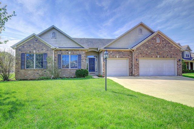 One of a Kind Custom Ranch w/Walkout Basement backing up to neighborhood Commons w/lovely green spaces. Home offers 4 bedrooms,3 full baths & 3 car attached garage. The foyer opens to a Great room w/gas log fireplace, w/open staircase down to its walkout basement sporting a second family room & bar area, its 4th oversized bedroom, full bath & unfinished storage and hobby area, 60 amp sub panel w/workroom. The Main level has spacious kitchen and island, w/new stainless appliances & large eat in capacity. The dining area is separate by one wall & overlooking the commons. Good size new deck for outside entertaining or relaxing & grilling, covered patio w/hot tub. The Master suite offers private bath, walk in closet & has a private sitting area currently enjoyed as dressing area & office desk. There are 2 other bedrooms on the main floor adjacent to a full bath for convenience. New: carpet/paint. Virtual Tour Floor plan will show special layout laundry room etc. Not a drive by must see!