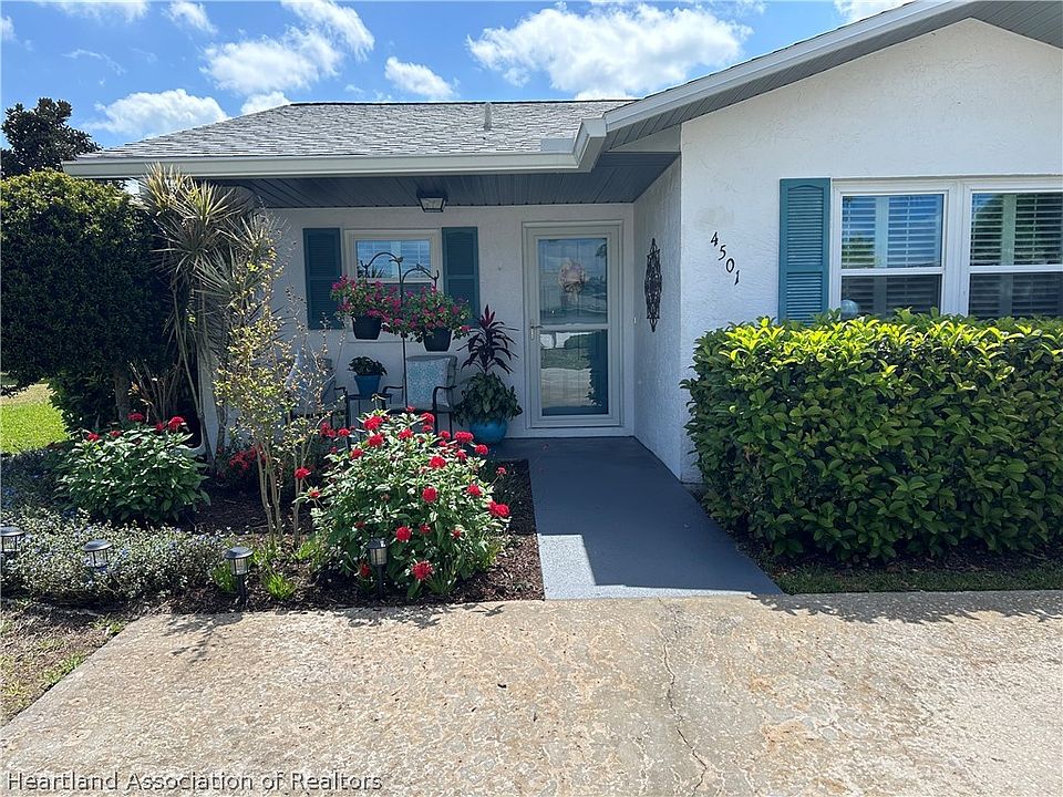 Forget rent, lot rent, or costly monthly maintenance fees when you step onto the front porch of this welcoming property. The kitchen has been updated with stainless steel appliances, under sink water filter, slide out storage racks, under cabinet lighting along with pot lights an pendants over a large island with extra drawers/shelves/electric outlets and USB ports. Open floor plan, hard floor surfaces throughout and plantation shutters in main living area. All electric switch plates replaced with modern "flippers" and freshly painted. Centrally cooled/heated all season room with pot lights, dimmer, fan overlooks expansive open and updated landscaping, magnolia, palm and purple glory trees. New roof in 2022, new energy efficient windows and all new gutters with 6 inch downspouts in 2022. 65 inch screen TV and almost all furniture convey in this bright and airy condo with room for kids and pets to play and access to all the amenities that Sun N Lake has to offer. You will love the shed that can be used for a golf cart or whatever other items you might want to store. In addition to all that, the Island View Restaurant is just a couple of blocks away in the event you want to dine out or take out. Sun N Lake also has two championship golf courses if you are a golfer. Sun N Lake also offers a community swimming pool, exercise room, playground, tennis courts, pickle ball courts, and shuffle board.