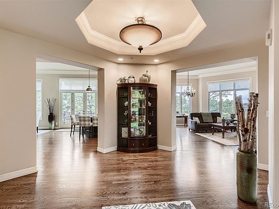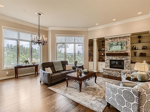 SHOWINGS START TUESDAY May 31st. Enjoy Memorial Day Weekend! You can have it all! Amazing Mountain and Valley views from your living room and deck, surrounded by tall Pine trees, and an elegant and fully updated Ranch Home at the Starbuck area of Castle Pines Village. Enjoy a herd of elk or deer right from your deck. Situated on a perfect corner lot, this lovely home is overlooking the trail that takes you to the fitness center and pool. Attention to detail throughout the house; professionally remodeled kitchen, granite, high end cabinetry, stone and glass insert over the 6 burner Gas Thermador Stove, new HVAC, and a Water heater with lifetime warranty from Applewood company. Prepare to be pampered with the property amenities such as smart blinds throughout the 1st floor, Determine the amount of light or privacy with the touch of a button or pre-program a set time for the blinds to be activated. The elegant Foyer greets you on this private and secluded feeling home. It includes; an open floor plan with refinished hard wood floors on the main floor, large living room, 2 fireplaces, large primary bedroom with spacious en-suite bathroom, elegant Dining room with fireplace and doors that lead you to the newly replaced deck (Timber Tech decking) where you can enjoy the view to the open space, trail access & beautiful forest. Gas line to the grill and remote control operated awning and sun shade. This deck is ready for you!. The walk-out basement is spacious & well designed and easy to accommodate long term guests. 2 Bedrooms & 2 bathrooms in the lower level, as well as a 2nd living room/movie room, plenty of storage, & a BONUS ROOM! Whole House Fire Suppression System. Air Purifier. Emergency System, 24/7 Security and manned gates. HOA pays for the irrigation water, snow removal, Fitness Center, Trails, 3 Pools, Tennis Courts & so much more! Don't wait to see this GEM, offers will be presented as they are received. No Post Occupancy Required. Virtual Tour. iGuided Tour.