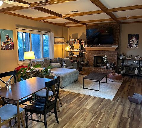 Welcome to your dream condo, where modern updates meet classic character! Step inside to an inviting open-concept living area featuring stunning updated flooring, exposed wood beams, and a cozy brick fireplace perfect for relaxing evenings at home. The beautifully renovated kitchen boasts sleek cabinetry, contemporary finishes, and ample counter space for all your culinary adventures. Enjoy year-round comfort with central air heating and cooling. The spacious primary bedroom is a true escape, complete with a large layout and a stylishly updated ensuite bath. Step outside to your private, fenced-in patio ideal for morning coffee, entertaining guests, or simply unwinding in your own outdoor oasis. Additional highlights include a convenient 1-car garage for secure parking and extra storage. This condo combines comfort, style, and functionality in a fantastic location. Don't miss your chance to make this exceptional home yours schedule your private tour today! tenant pays utilities. 12 month lease