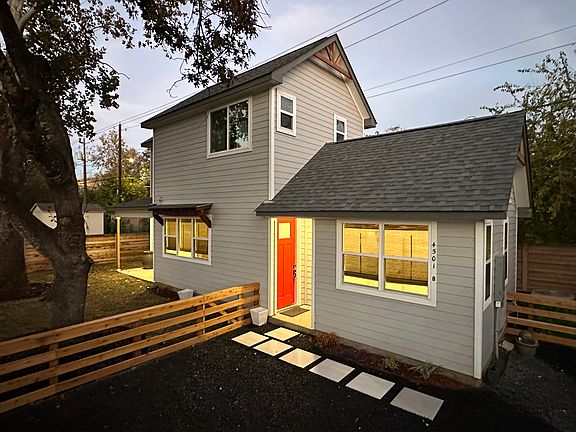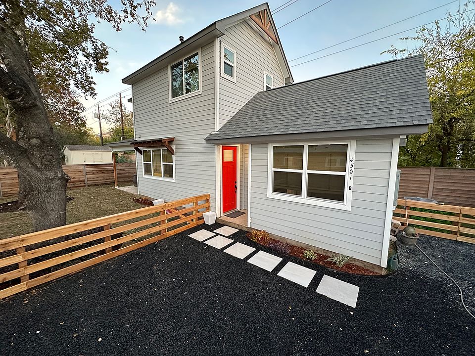 This new and RARE private 3/2 in Delwood 2 Treehouse! (back to Mueller Northwest Greenway) will be ready for lease in June, The location is literally on the park, and is an easy walk (No need to cross Airport) to Dell Children's Hospital, food trucks, bus stop, and lots of retail. This is a tucked away back house with a private drive, so it's got all the benefits of living in Mueller, but with a big yard, and mature trees and no HOA. Interior has white oak colored pet durable Luxury Vinyl Plank flooring on both levels. Tons of light with these huge windows that show the mature trees in the spacious yard, complete with very high vaulted ceilings. Walk-in closet in main bedroom and walk-in kitchen pantry. Stainless steel LG and Samsung appliances. Please inquire if interested! $2800 per month , yard maintenance included. No smoking please. Small pets welcome! Thanks! Tenant IS NOT responsible for yard upkeep within reason. Plan for yard is xeriscaping but it will be maintained by a professional. Pet policy is negotiable depending on pet. But we require owners to fix a damage inflicted upon the property inside and out.