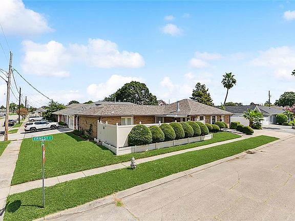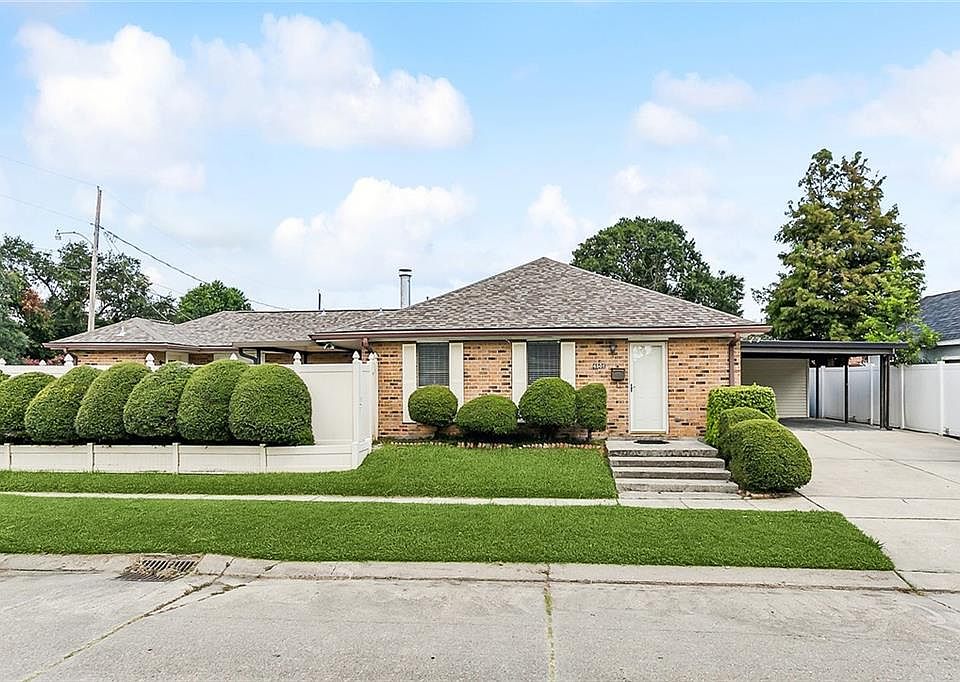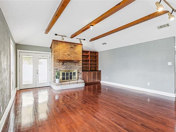 Wonderful corner lot! You'll love the living room with its' cozy fireplace, soaring 10' ceilings featuring exposed wood beams, built-in shelving, wood plank flooring and French doors leading to a covered patio. The kitchen will be a great place to gather, with a huge center island offering loads of storage, a spacious pantry, sleek Kenmore Elite appliances (which includes the refrigerator) a brushed stainless steel single handle kitchen faucet with pullout spray, granite counters plus access to the carport and a convenient dog run. The hallway embraces natural light from its' transom windows. The spacious primary bedroom boasts 9" ceilings. This unique floorplan offers access to the garden from most rooms with French doors featuring built in blinds. You'll love the convenience of the large double carport, keeping your cars cooler in Summer and you dry during rainy days. Plus, it's a wonderful spot for crawfish boils and parties! Enjoy a detached storage room with A/C for projects or additional storage. Roof is only 2 years old!