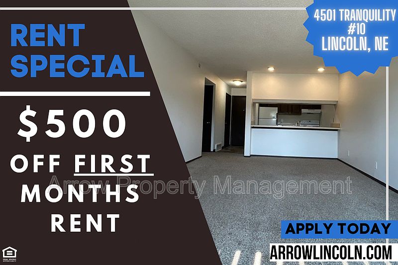 Welcome to 4501 Tranquility, located in the heart of Lincoln, NE. This spacious 1-bedroom, 1-bathroom apartment offers convenience and comfort. Enjoy the ease of off-street parking and the convenience of a dishwasher in your modern kitchen. Step outside onto your private balcony and take in the fresh air. Shared laundry facilities make chores a breeze, while small pets are welcome to join you in your new home. For those in need of extra storage or covered parking, detached garage parking is also available for an additional fee. Directly behind the apartments is a newly built park equipped with a full jungle gym, basketball court and rubber flooring. Additional information- Pets negotiable with a $150 non-refundable pet deposit and monthly fee per pet. Monthly fees- CAM fee of $15 and Shared Utility Fee at $35/month per month Tenant pays for electric and gas and $60/month for Spectrum internet; landlord pays for gas, water and trash service. This unit does not accept a Section 8 Voucher. All Arrow Property Management residents are enrolled in the Resident Benefits Package (RBP) for $30.00/month which includes liability insurance, credit building to help boost the resident's credit score with timely rent payments, our best-in-class resident rewards program, and much more! More details upon application. Amenities: off-street parking, dishwasher, balcony, shared laundry facilites, small pets welcome, detached garage available upon request for an additional charge, extra storage space available for an additional charge