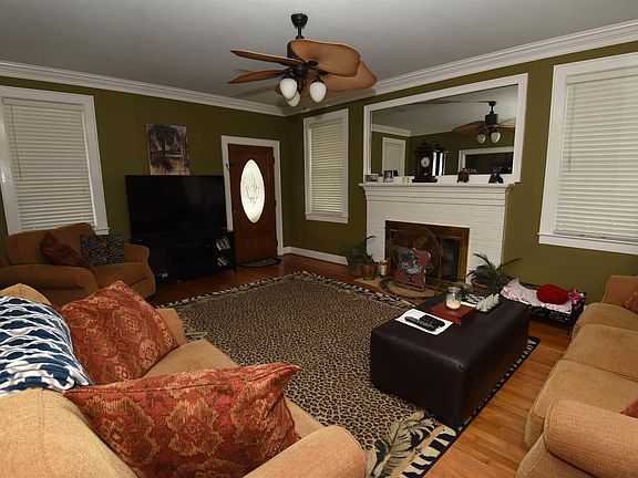- Living Room: Fireplace, Floors-Hardwood, Molding, Ceilings-High (over 9 Ft), Ceiling Fan