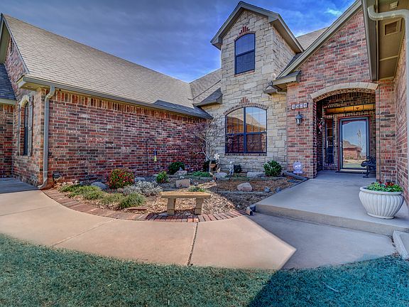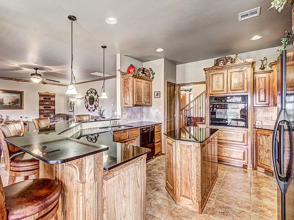 This exquisite home backs up to hole #3 on the popular Cimarron National Golf Course. Sit in the enclosed patio area or on the large composite deck and enjoy the beautiful view. This home offers four bedrooms, large study (possible 5th bedroom), three full baths, a dream kitchen with beautiful black granite, custom pull out drawers, gas stove and breakfast bar. The open living area is cased with crown molding and has a corner gas forced air fireplace. The Master suite has his and her vanities, his and her walk-in-closets as well as a jetted whirlpool tub. The over-sized garage has a built in workbench with cabinets, a storm shelter and an extra storage room The side entry garage has extended parking for an RV with sewer and electric available. Covered patio has been enclosed with heat and air and sq. ft. has NOT been added to the 2724 (MOL) sq footage. This property has a NEW roof and H&A are only two years old. This home is a must see and priced to sell! Move in Ready!!!