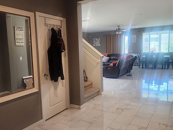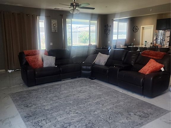 This airy 5-bedroom/ 3.5 bath home shines bright with natural light illuminating from every direction. It was custom built for the Seller a mere 4 years ago and hosts 2-master bedrooms (upstairs and downstairs), yet and still, has an entirely separate wing for in-laws and/or children alike. The upstairs master is on a wing of its own; not directly neighboring any other bedroom. Both wings and an additional bedroom all culminate into a spacious loft-style family room for ultimate family-time. The open-concept floor plan living area lined with marble design polished porcelain tile flooring is designed to maximize sitting and family interaction potential. The kitchen contains granite counters, espresso wood cabinets, a 10-ft pantry, island w/ barstool seating, as well as additional space for dining. It also comes fully equipped w/ Stainless Steel Whirlpool Appliances. Landscaped front and backyards. The front yard was designed in a low maintenance desert vibe. While the backyard embodies a custom patio covering (w/ceiling fan), turf, and an absolutely beautiful flower bed containing fruit trees, roses, etc. This home is massive with 3,300 sqft of living space giving possibilities galore. Come check out your next home; it’s waiting on you!
