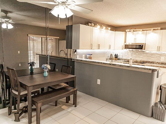 This beautiful move-in ready home has so much to offer! Newly remodeled open kitchen with modern white cabinets with built-in wine rack and tile backsplash & new stainless steel cooktop, oven & microwave! Tile throughout the main level. Updated vanities with dual sinks in the master bathroom with walk-in shower and large walk-in closet. Very spacious bedrooms with private Juliette balconies. Large fenced & screened-in patio with storage shed and additional large green space right outside. Full set of accordion shutters! The HOA is responsible for roof and patio fence and also includes basic cable & water! Family friendly with playground, 3 pools with kiddie pool, volley ball, tennis, raquetball and more! Amazing location close to I-95, the beach & Palm Beach Outlets! Come secure it today!