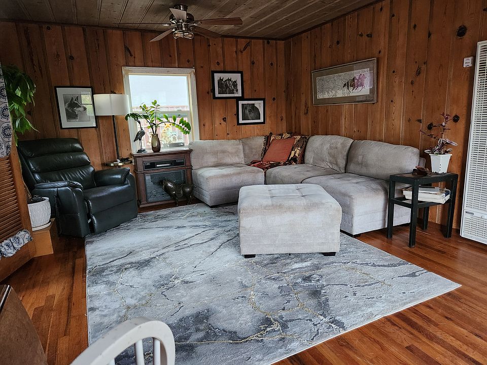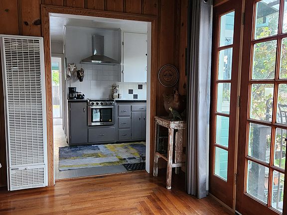 Freshly remolded small home. Main bedroom with ample closet, small bedroom on converted back porch. Small functional kitchen, dining space in large living room. Living room with hardwood floor, knotty pine paneling and french doors to covered deck. Divided entry provides office space. Bathroom has new fixtures, cabinet space, bathtub with shower. Converted back porch also has laundry space. Fenced yard. Plenty of garden opportunity. Month to month initially. Utilities included (mostly). Please no smoking inside.