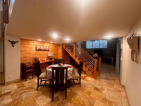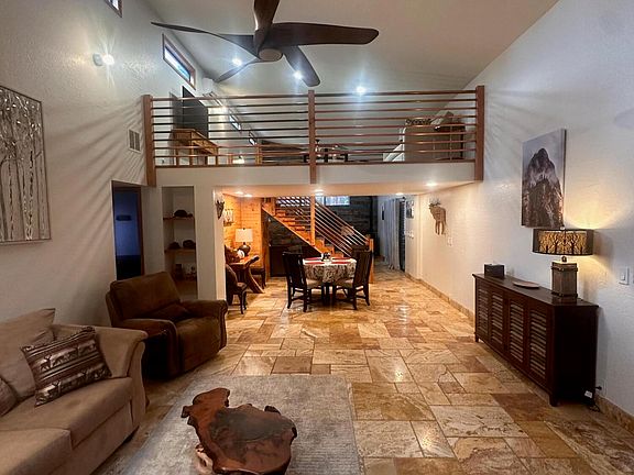 Custom cabin with exceptional architecture and unique details. Enjoy custom wood finishes, travertine floors, wine rack, New skylight, and copper railings. Features include a spacious loft with vaulted ceilings, a master suite with a walk-in closet, dual sinks, and a custom shower. The second bedroom includes dual closets and a walk-in. The kitchen boasts an eat-in area, granite countertops, and all appliances. Additional amenities include an extended one-car garage, cobblestone-covered back patio, and partially shaded front and side patios. All this in The Portal 2 Gated Community.