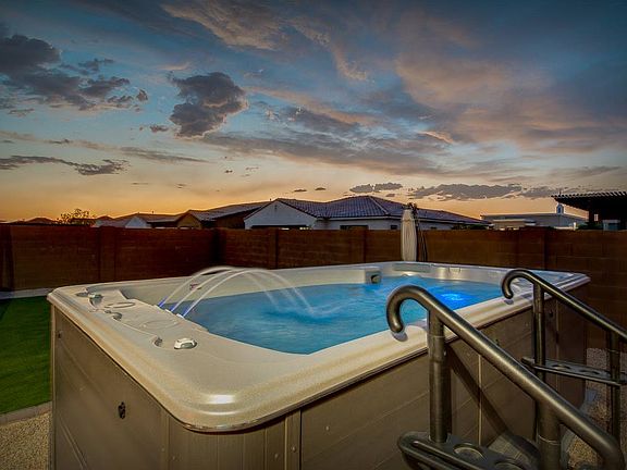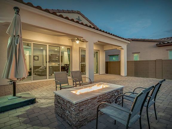Don't wait for a new build, move into this 2018 Eastmark home now! Complete with backyard landscaping, a huge swim/spa, and all the window treatments! This tasteful Cal Atlantic 1 story home features wood-look plank tile, carpet with the upgraded pad, 12ft ceilings, and 9ft doors with brushed nickel hardware. The kitchen has staggered glass front cabinets, a gas cooktop, and gas double wall ovens complimented with a matched stainless fridge and dishwasher. The large island is perfect for breakfast and the large dining area is showcased by the wall of glass. A single and a double slider open up to your 30ft extended covered patio that looks out on the pavered back patio complete with turf, a gas fire pit, and a huge swim spa. The trampoline is yours if you want it! The rest of the home features 4 bedrooms and 2 bathrooms, both with dual sinks and granite countertops. The master has a walk-in shower and the guest bath has a tub/shower combo as well as an executive height counter. The 3 car tandem garage has plenty of room for toys/trucks, wifi-enabled opener, and also has a whole house water filtration/softener. The AC unit is a 3 zone multi duct system and there are 3 wifi-enabled thermostats in the home. All of the rooms have ceiling fans. Enjoy all that the Eastmark community features. A community pool & splash pad, restaurants, community center, amazing parks, and walking paths for miles! The new Queen Creek High School and the Safeway complex were just completed this year. Eastmark is incredibly well-appointed and popular. Stop by and check out this great home today!