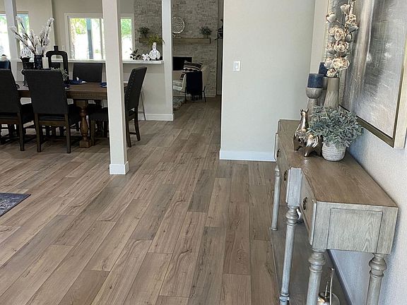 Beautifully remodeled 2200 sq ft 4 bed 2 1/2 bath pool home sits on approximately 1/3 of an acre. Walk in through the new grand foyer where you find 10 ft ceilings, crown moldings, luxury vinyl plank floors, Pella windows, tons of recessed lighting and a recently added powder room. The kitchen showcases Calacatta quartz countertops adorned with glass tile backsplash, 9 ft center island with built in microwave, shaker cabinets, custom hooded vent, coffee bar, walk-in pantry, upgraded stainless steel appliances and a breakfast nook overlooking the newly refinished pebble tec pool and waterfall. The family room boasts a floor to ceiling stack stoned fireplace, crown molding and a new slider leading out to the covered patio and large private backyard. Retreat into the primary suite featuring