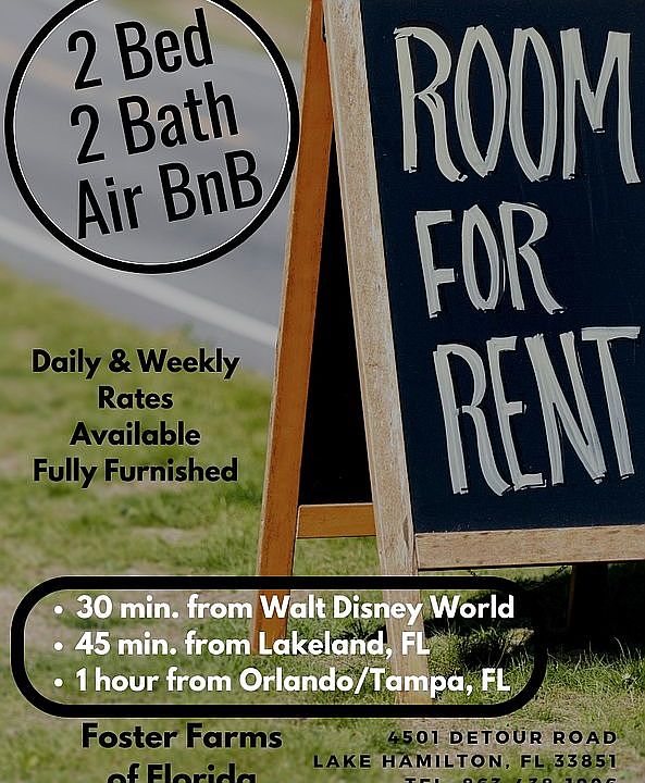 This a 2 BD, 2BA FURNISHED mobile home with a screened in back patio, covered carport and a full size washer and dryer. It s located on a fully fenced 20 acre FARM adjacent to the main house and is conveniently located 30 minutes from Disney, 45 minutes from Lakeland and 1 hour from Orlando/Tampa.