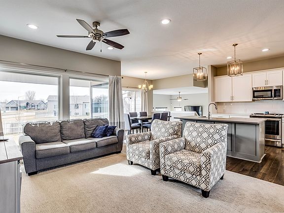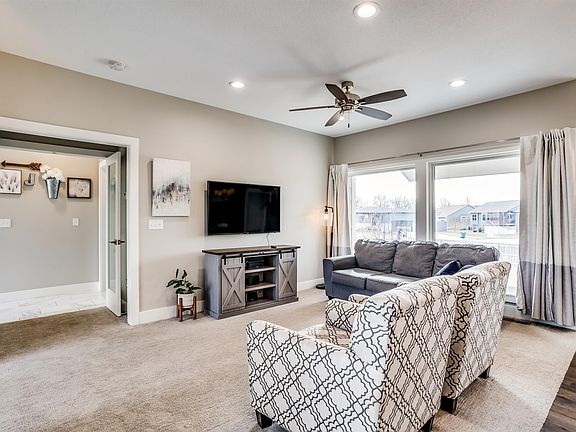 Welcome to this beautifully maintained family home in the highly desirable Edgewater neighborhood! Situated on a large cul-de-sac lot, this home offers the perfect blend of space, functionality, and luxury. The bright and airy living room features large picture windows, allowing natural light to flood the space. The kitchen is a chef’s dream, with a quartz-topped island, abundant cabinet space, and a walk-in pantry, making it perfect for both everyday meals and entertaining. The expansive dining room comfortably fits the whole family. French doors lead to the luxurious master suite, which boasts a spacious bedroom, private bath with double vanity, and a walk-in closet. The versatile flex level offers a cozy family room with a gas fireplace and easy access to the multi-tiered patio and fenced backyard, complete with a sport court for fun and fitness. This level also includes two generously-sized bedrooms, a convenient drop-zone at the garage entrance, and a laundry room. The fully finished basement provides even more space with a large family room, an additional bedroom, and a full bath—ideal for guests or family members seeking privacy. Located in the vibrant and social Edgewater neighborhood, you'll enjoy incredible amenities and be within the highly acclaimed Maize School District. This home is truly the ideal blend of comfort and convenience—don’t miss out on this opportunity! Some information may be estimated and is not guranteed. Please verify schools with USD 266.
