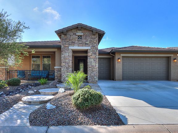 You will LOVE this Pavona model, a stunning 2 bed, 2.5 bath home with den, across from a pocket park. A travertine walkway leads to the inviting front entry, while the landscaped backyard features custom lighting and is plumbed for natural gas to the BBQ and fire pit areas. An extended covered patio with travertine tile offers the ideal space for entertaining or relaxing. The gourmet kitchen boasts 42'' cabinets, quartz countertops, tile backsplash, stainless steel appliances, gas cooktop, under‑cabinet lights, and a butler's pantry. The master suite includes a 2‑foot extension, and the guest bedroom has an en suite bath. A 2‑car garage with 4‑foot extension plus golf cart garage adds convenience. Upgraded A/C and a whole‑house water treatment system with R/O, complete this exceptional home.
