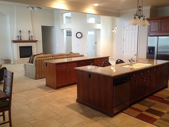Lovely Quail Lake custom-built waterfront home has a stunning tower entry into the great room with custom fireplace and formal dining room. Terrific open floor plan that accentuates available lakefront views from most rooms. Home features a great-room style with a 16 foot ceiling in great room and crown molding accents. Open gourmet kitchen and breakfast area w/two tone cabinets, five burner gas range, two ovens, breakfast bar, and large serving island. Kitchen has abundant cabinetry and features a walk-in pantry for additional storage. Guest room w/bath off the kitchen can also serve as an office area with lake view. Master suite is very spacious with large windows and private access door to the outdoor patio/dock/lakeside area. The master bath features oversized shower, double sinks and big soaking jetted tub with custom tile and tumbled stone compliments throughout. Master suite also features his and her walk-in closets with ample hanging and shelving use areas. Hall bath also features custom tile installation and natural glass block lighting. Two extra bedrooms and large laundry room are located off the hallway. Backyard is very inviting, with large grass area and open patio space. The back yard faces east, affording beautiful sunrise views and afternoon shade for summer BBQ fun. Recent addition of electricity generating solar panels makes for a cost effective home.