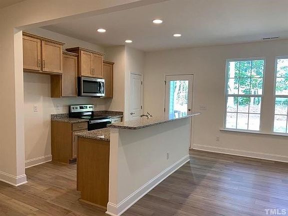 Spectacular wooded view from elevated deck, kitchen, breakfast area and owner's suite. Sealed crawl space for extra storage! Gorgeous kitchen w/ gas cooking, upgraded cabinetry, over-sized island seats 4+, granite countertops, and cinnamon walnut rigid-core flooring throughout first floor (stunning!). Owner's Suite is huge (25x15) with quartz countertops and under-mount sinks in both owner's bath and secondary bath. Secondary bedrooms are generously sized (would also make for a nice home office or studio). This popular Litchfield Plan is one of the last remaining homes for sale in Malory Square - a real crowd pleaser w/ open layout, large dining area, spacious family room, generously sized bedrooms and wooded view is spectacular. Just 14 minutes to downtown, 10 minutes to White Oak Shopping Center and 20 minutes to Crossroads in Cary -- location is excellent. Stop paying someone else's mortgage and invest in yourself and your future with home ownership. $3,000 in closing costs with our preferred lenders. *Photos are of similar homes but selections may vary*