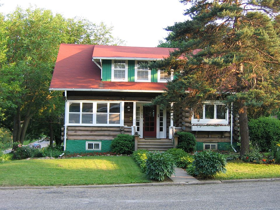 1.5 story bungalow. Second story 555 sq ft. Main floor 829 sq feet. Exterior walls made of logs. Interior is wallboard. Drive-in basement/garage is totally unfinished; no wall separates parking spot from remainder of basement. Unpaved driveway. Fireplace. Original windows.