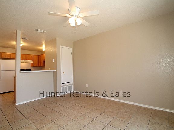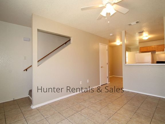Great two-bedroom town home in south Killeen, open parking, large living room with vertical window blinds, breakfast bar at rear of living room, large storage room below stairs, kitchen with refrigerator, oven, and dishwasher, plenty of cabinet space, large laundry room, guest bathroom downstairs, two bedrooms located upstairs with full bathroom, energy efficient central air and heat, window treatments throughout, and ceiling fans.