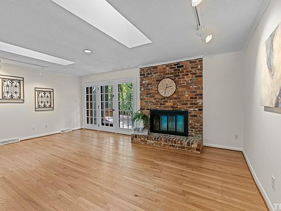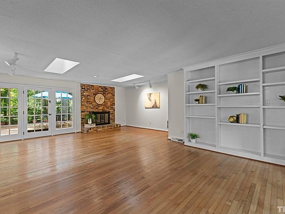 Don't miss out on this one story home in popular Hickory Hills Subdivision with cul de sac lot and huge backyard. 4/5 Bedrooms and 3 full baths. Hardwood floors throughout most of this home. Spacious Family Room with skylights, wood burning fireplace, and built in shelves. Separate Formal Dining Room with crown molding leading into Kitchen with ample cabinet storage, electric range and dishwasher. Primary Bedroom w/ large walk-in closet, and en suite bathroom with whirlpool tub and separate NEW walk-in shower. Three or four additional bedrooms on the main level w/double windows. New carpeting. Hardwoods under carpet in hallway. Office space upstairs with lots of windows for natural light overlooking huge back deck area perfect for entertaining. Walk to North Hills, Quail Corners, Quail Hollow Swim Club and Eastgate Park. 10 to 15 minute drive to Downtown Raleigh. Easy access to 440.
