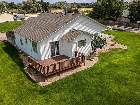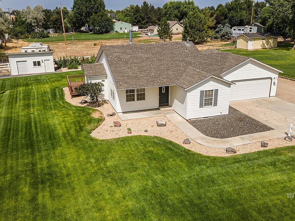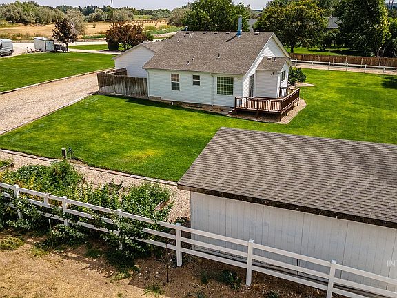 This fantastic single-level home is located near Wilson Ponds and the Nampa fish hatchery. The home is at the end of a very quiet dead-end street, offering the perfect blend of country and city living. Situated on half an acre with larger lots surrounding it, the property provides a peaceful and private setting. It's only an 8 minute drive from the 12th Avenue Walmart, making it convenient for town access, the Nampa greenbelt, and less than 15 minutes from the interstate. The large lawn features a full sprinkler system, garden boxes and a very productive raspberry patch. There are two additional buildings on the property, one is fully finished with concrete floors, power, insulation and a roll up door. There is also plenty of room to build a shop of your own. Additionally, there is ample parking for trailers or Rv's. The house is nicely done in neutral colors and is ready to make your own. The location of this property can't be beat!