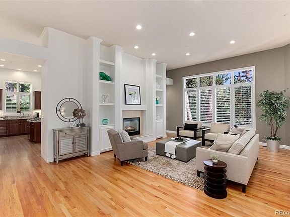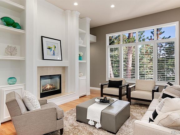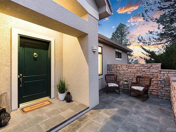 This beautiful 4 bedroom, 4.5 bathroom home is located on a quiet cul-de-sac in the secluded Starbuck neighborhood within the private gates of The Village at Castle Pines. Set among soaring pines, this home sits on a very private lot with plenty of outdoor spaces to entertain or just sit and enjoy peace and quiet. Entering the home, a large stone courtyard welcomes you into your new home and into an elegant entry way with soaring ceilings and ample entertaining space. Main area features a huge living space, formal dining room and large office with built in bookcase. Open concept great room features a huge kitchen with beautiful granite countertops, stainless appliances, gas cooktop and double oven overlooking large family room with beautiful 2 way fireplace and large breakfast nook. Wood floors throughout main level. Huge wall of windows overlooks beautiful pines, back deck, lots of wildlife, lets in lots of natural light and views of Pikes Peak! Gorgeous wood shutters throughout entire home! New paint throughout!