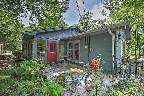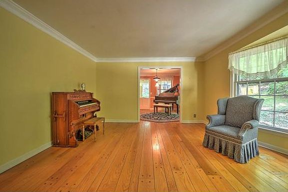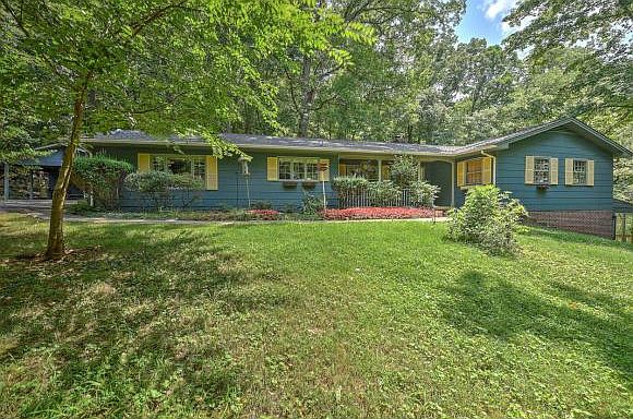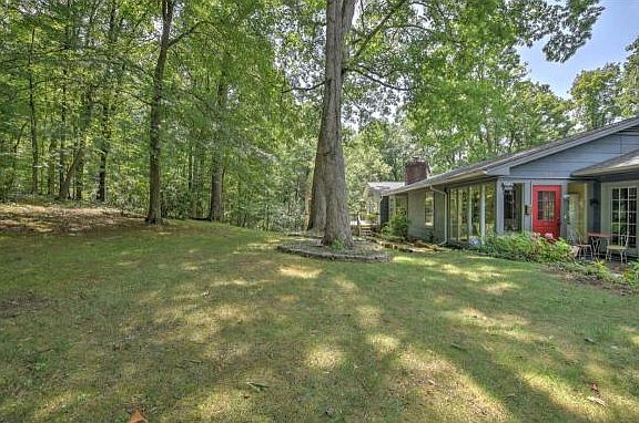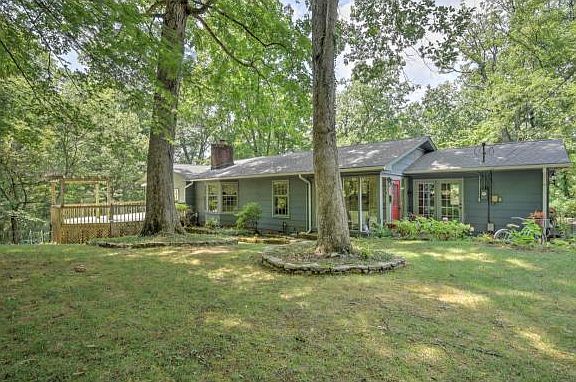 Amidst a "fairy tale" setting you'll find this quaint, French-style home surrounded by lovely trees and "secret" flower gardens, with winding paths for strolling through the woods. A marble foyer welcomes you to come inside this spacious, one-level home with beautiful, oak hardwood, pegged floors in the living and dining rooms, crown moulding, hardwood in all the bedrooms and wide plank pine in the kitchen/breakfast rooms.  Enjoy the outdoors on the covered front porch, the back deck (with entry from the master bedroom or the living room), the side patio or from the glassed-in sun room.  A stately, brick fireplace provides a comfortable atmosphere for reading or taking a nap. Dutch doors between kitchen and great room, kitchen and glassed in porch and between master bedroom and back deck, add to the uniqueness of this charming home. Live the good life on this beautifully, landscaped 1.64 acres of trees and flowers.  Â