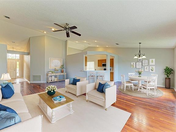 Nestled at the end of a quiet cul-de-sac, this 3-bedroom, 2-bath home sits on an oversized lot and has panoramic views of the lake, perfect for enjoying breathtaking sunsets. From the moment you arrive, you’ll notice the fresh exterior paint and the peace of mind that comes with a newer roof (2022). Inside, there are soaring cathedral ceilings, an open floor plan and rich Brazilian cherry hardwood floors. The kitchen seamlessly connects to the living and dining areas and features wood cabinetry, a pantry, new fridge and a cozy breakfast nook area. Expansive sliding doors perfectly frame the lake view and lead to a freshly painted, covered, screened-in lanai—ideal for dining al fresco, entertaining friends, or simply relaxing while soaking in the scenery.The primary suite is a retreat of its own, complete with high ceilings, sliding glass doors overlooking the lake, and a spacious en-suite bathroom. The bath includes a walk-in shower, granite vanity, separate water closet, linen storage, and a large walk-in closet. Two additional bedrooms and a full guest bath are located at the front of the home, offering comfort and privacy for family or guests. Additional highlights include fresh interior paint and a laundry space within the newly painted garage. Just a short stroll away, the resort-style amenity center offers a luxurious pool, basketball and tennis courts, pickleball, sports fields, and a new playground—all for an incredibly low HOA fee of just $69 per month. Sabal Harbour is one of the area’s most sought-after communities for its central location and lifestyle offerings. You’ll enjoy easy access to shopping, UTC Mall, waterfront dining, I-75, downtown Sarasota, and the world-class beaches of Anna Maria Island. If you’ve been searching for a peaceful neighborhood with impressive amenities and an unbeatable location, look no further—welcome to 4506 Cabbage Key Terrace and let your Florida dreams begin!