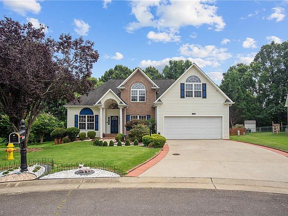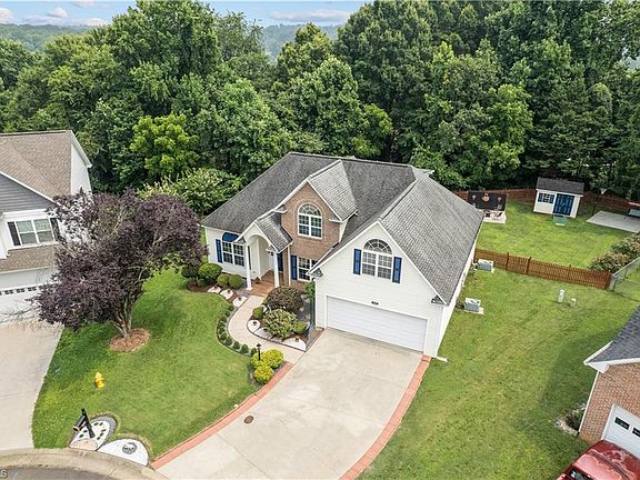 Situated in Winston Salem's picturesque Pfafftown village with its well acclaimed WSFCS school zone and only three minutes from Reagan high school. This meticulously maintained, move-in ready home has an open concept living room with modern granite fireplace and soaring vaulted ceilings that flows to a large eat-in kitchen. Granite countertops, dark brushed stainless steel Samsung appliances and glass tiled backsplash create contemporary yet warm feel to the space. Primary suite on main features tray ceilings, large window, walk-in closet and a bathroom with 2 vanities, whirlpool tub, separate shower and a nicely tucked away WC. Formal dining room is used as a home office. Upstairs boasts two good size bedroms, full bath and an oversized bonus room (FROG). Updated light fixtures. Private, tree-lined backyard, with its two tiered deck overlooking a flat, fenced yard to enjoy many outdoor activities on this 0.36 acre lot.