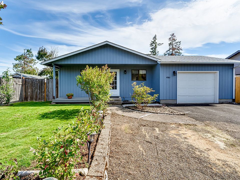 Cute, secluded starter home with the works! One owner home just on the market with newer 30 year roof (2016), brand new water heater and bamboo flooring throughout. Garage with space for a workshop has built-in cabinets for storage. Purchase includes, FS Refrigerator, washer and dryer and garage chest freezer. Private, sunny cement patio and plenty of space for gardening in the fully fenced backyard. There are producing plum trees and mature blueberry bushes. Forced air heating and cooling! Come have a look.