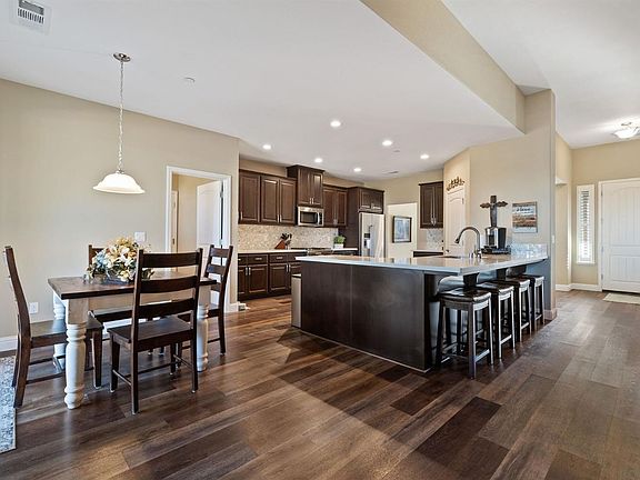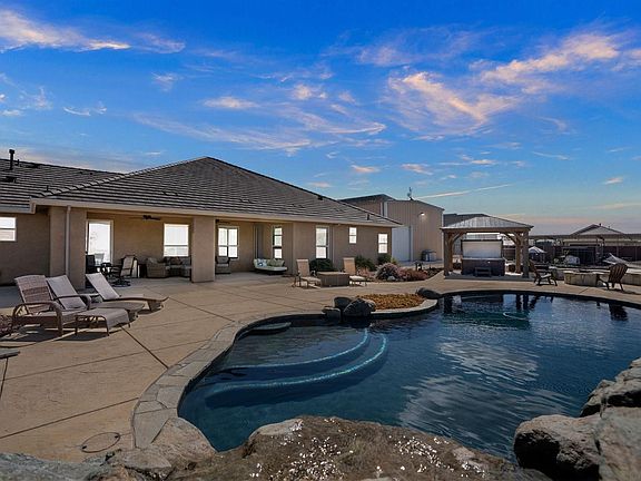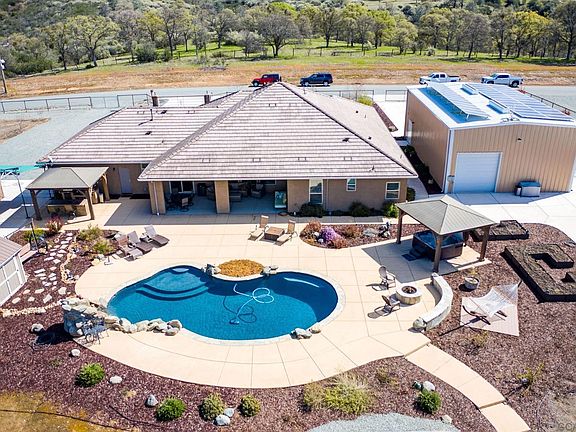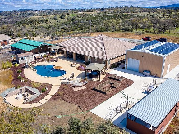 Amazing 4 bedroom home on 5 acres in Olive Orchard Estates with gated entrance. Open floor plan perfect for entertaining. Quartz counters with upgraded cabinets - stainless steel appliances including the refrigerator and pantry. Nook area off kitchen plus formal dining area. Additional room possible for additional bedroom or office. Spacious master suite with access to back patio area, dual sinks, soaking tub plus large shower with dual shower heads & large walk-in closet. Plantation shutters thru-out. 30x50 metal shop with two 12x14 roll up doors and a 10x10 with access to the backyard. Plenty of cabinets for additional storage. RV dump & 50 amp hook-up. Built-in swimming pool with waterfall plus separate personal hot tub. Outdoor kitchen area with everything you need for barbequing. Castlebrook 3 stall barn with tack area, storage & area where plumbed for possible wash room. 4 stalls are possible. 12' raised isle breezeway. Solar is owned & is largest system available. Front yard is fully landscaped. Four covered dog kennels (12x12 each). Great views & unbelievable sunsets.
