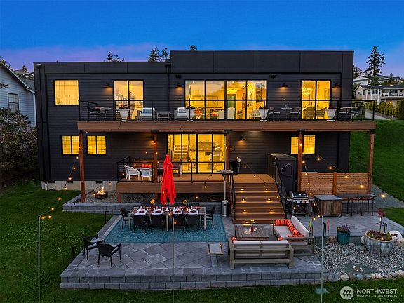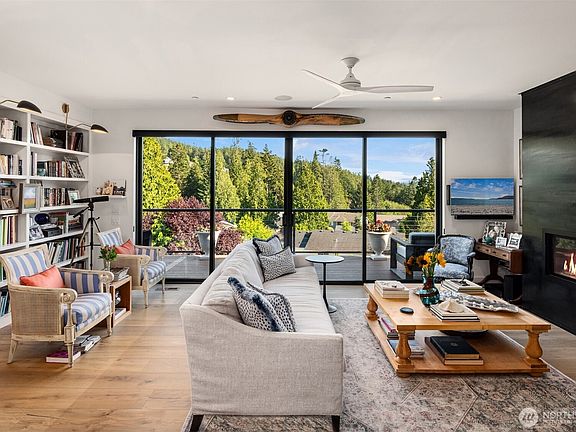 Interior designer's personal home offers luxurious finishes + modern design. Marble, steel, copper, soapstone, wide planked floors and unparalleled lighting integrate together in this new home offering views of Burrows Bay & Olympic Mountains. Bask in the sun on dual decks that run the entire length of the home overlooking one of 2 expansive paved courtyard designed to entertain in style. Chef's dream, offers corner office, beverage bar, Cafe Range, soapstone countertops on massive Island & Flemish glass detail. Main-level living offers spa bath, radiant floor heat & closet systems. Lower level offers private guest space w/ kitchenette. Plus an add'l 800 ft of flex space ideal for separate MIL. Oversized 2 car w/ shop and EVSE.