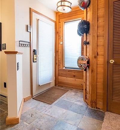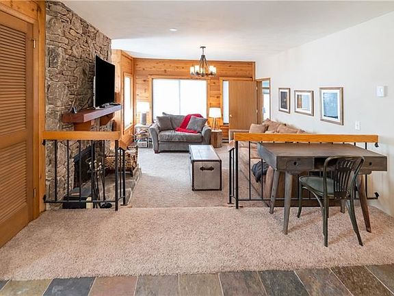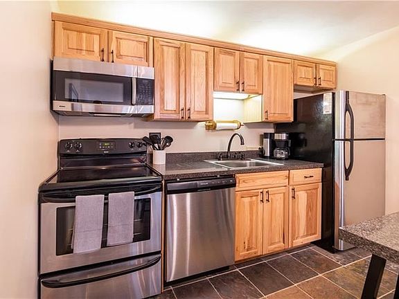 REMODELED end condo with 2 bedrooms and 1 bath. Kitchen has beautiful maple cabinets/drawers with stainless appliances. The dishwasher was recently replaced. Entry and kitchen/dining areas have slate tile floor, there's also a built-in table with storage there. You'll find new lighting fixtures and thermostats for the baseboard heaters. In the living room there's a mountain stone floor to ceiling wood burning fireplace along with a sleeper sofa. The bathroom had a makeover! New vanity, sink, toilet, and lights. A super shower replaced the old tub. A stack washer/dryer come in handy! Guest bedroom has bunk beds, a futon, and access to the back deck that gets plenty of sunshine! Step down to ground level to walk the dog or hike to resort. Shuttle stop is #15. Property is being sold with furniture and accessories. Easy walk to summer amenity center with heated pool and tennis courts.