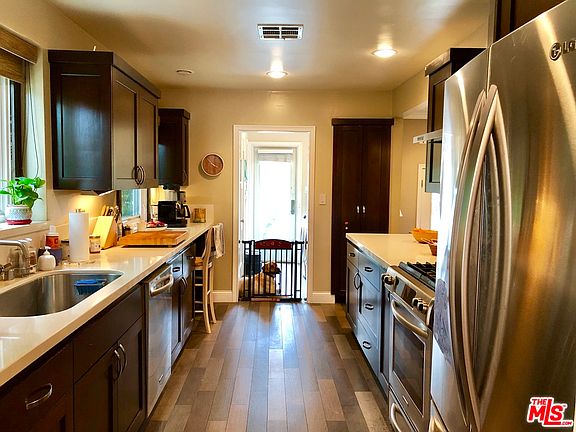 Available June 1. Wonderful curb appeal on a quiet tree lined street in a very desirable Sherman Oaks neighborhood, in Dixie Canyon Elementary School district. A best kept secret neighborhood. This home has been upgraded throughout. Newer Kitchen with upper end stainless steel appliances, Cesar stone counters, large farmers sink. Breakfast Bar opens to a family room with glass doors leading out cover patio and enormous yard. Italian ceramic plank tile compliment the kitchen and family room. Light and bright home with gleaming dark hardwood floors, two decorative fireplaces, crown molding through most of the house. Both bathrooms are redone. Main bathroom has Jacuzzi tub, shower glass tiles. Bonus room off the two car garage is a great home office or music/ art studio. This home has a living room and family room, as well as a formal dining room. Laundry room washer and dryer included in lease. Will consider pet with additional deposit. Gated driveway.