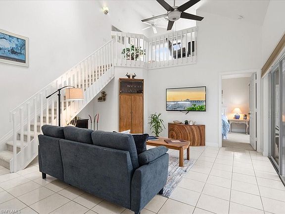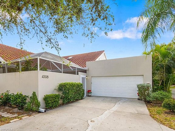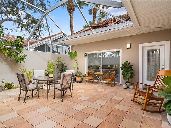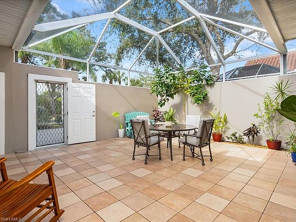 This unique end unit courtyard villa lives like a single-family home and features a PRIVATE 480 SQ FT SCREENED COURTYARD with endless potential, including ample space to install a private spa/jacuzzi. Pride of ownership is evident, with great room design with soaring ceilings, 2 sky lights, and an abundance of natural light. The kitchen has been updated with granite counters, raised panel cabinetry, tile backsplash and stainless-steel appliances. Both baths have also been tastefully updated. In addition, the seller recently installed wood-like flooring in the loft area, and new AC compressor in 2022. Both bedrooms are located on the first floor, each having private sliders leading to the courtyard. The large private master bedroom with cascading windows has an additional storage loft. The open upstairs LOFT/DEN/STUDY opens to a SEPARATE 190 SQ FT OUTDOOR ROOFTOP SUNDECK. TWO CAR ATTACHED GARAGE, pet-friendly, and bbq grills allowed. Terrific location with short bike ride or walking distance to famous Seed To Table, and only 200 feet to the pool and tennis courts! Residence enjoys a quiet and preferred rear-of-community location with ample distance from Immokalee Road. The condo association takes care of the landscaping, water, sewer and irrigation. This home is move-in ready, and new roofs were installed in 2018.