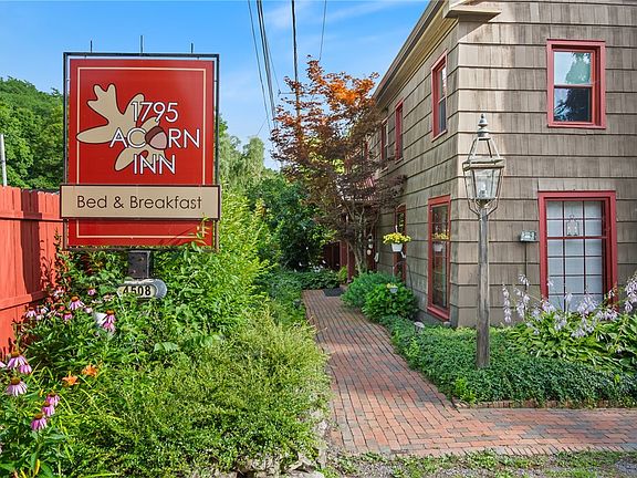 CAN WE TEMPT YOU WITH A NEW LIFESTYLE? If you can cook, love talking to people, possess computer skills and a general knowledge of the internet, you can do this. Ever wanted to own a B&B? The 1795 Acorn Inn, nestled in the Bristol Valley of NY’s scenic Finger Lakes, is a long-time AAA Four Diamond Award recipient. Less than 4% of establishments receive this award. Two immaculately-maintained buildings allow for a variety of options. Five elegant guest rooms, each with ensuite bathrooms, fireplaces and fine furnishings. The Dining Room and Gathering Room offer warm and comfortable common areas. This distinguished, historic home, built in 1805, has always been lovingly maintained. Fall in love with the fabulous owner’s quarters on the 2nd floor of the Barn. Built in 2017, it’s spacious and open with a modern, European kitchen, granite countertops, gas fireplace, palatial bathroom (air tub) and spacious walk-in closet. Relax outdoors and enjoy evening meals al fresco on the 16’x16’ composite deck with views of the lush, tranquil, fenced-in gardens. Plenty of storage and a cozy loft complete this private space. The 1795 Acorn Inn enjoys a 5-star rating on Trip Advisor and Google and plenty of returning guests. During all seasons, visitors from near and far, vacation in the Finger Lakes for its scenic beauty… waterfalls, hiking, gorges and stunning, clear lakes. Wineries, breweries, distilleries, concerts, festivals, skiing and historic sites are also a major draw. Close to Canandaigua, Naples, Honeoye, Geneva and Rochester, with day trips to Niagara Falls and Corning Museum of Glass easily within reach. New metal roof and gutters with Leaf Filter gutter protection installed in December 2024. Square footage information, (and layouts) provided by the owner. Barn square footage (guest suite and owner’s quarters) is not included in the public record. All improvements have been permitted by the town of Bristol, as well as the certificate of occupancy. This is a turnkey, profitable, year-round business that has been operating for 35 years and offers a welcomed change for anyone ready for a more peaceful, rewarding lifestyle. Owner available for training.