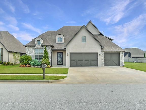 Gorgeous home with 5 beds/4.5 baths in Sunset Hills! This home has everything you could want with theater room, game room, formal dining, study, chefs kitchen, outdoor fireplace. Beautiful entry w/ curved staircase, hardwood floors, new carpet, and new paint. Upscale finishes & trimwork! Neighborhood pool, park and Broken Arrow Schools.