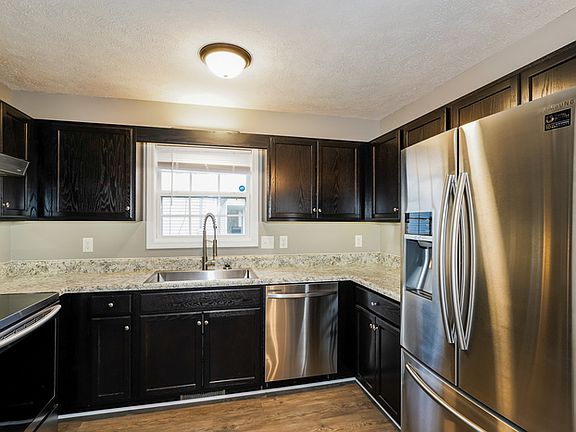 Step into a spacious living room where warm tones and natural light fill the space, opening the way toward a connected kitchen and dining area. The kitchen features sleek granite-style countertops, dark wood cabinetry, and stainless-steel appliances that offer both function and a clean finish. Every detail feels cohesive and purposeful, creating a setting that's as comfortable for daily routines as it is for relaxed evenings in.