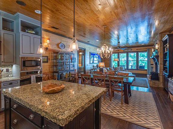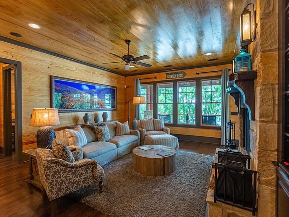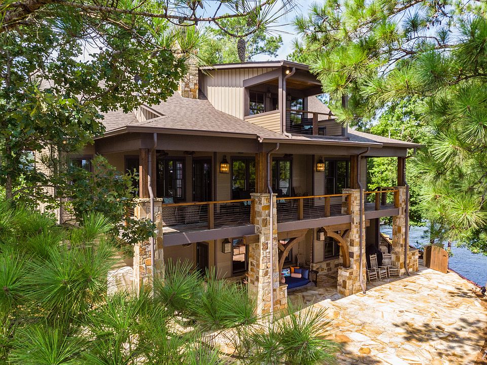This wonderful lake home was crafted with care by Newcastle Homes for its owner's own family. As you can imagine, no expense was spared, it was designed to perfection, & the quality is top-notch. When you tour this home you'll be impressed by the warm wood walls & unique fixtures throughout. This lake haven checks all the usual boxes for a lake home as well as some extras: spray foam insulation, Rinnai tankless water heater system, slate covered deck, flagstone terrace, lakeside fire pit, swinging bed, 2 boat lifts, double PWC ports, & more! 1st level: open floor plan, stone fireplace, generous kitchen, Master Suite, Guest Suite, & laundry. Lake level: 2 more Guest suites, 2nd family room, 2nd full kitchen & 2nd stone fireplace. 3rd level: 5th Guest Suite w/private balcony & Theater room!