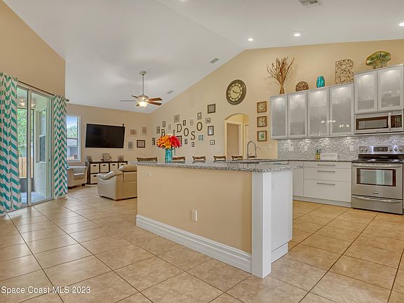 Nestled in a quiet neighborhood in SW Palm Bay, this 4 Bedroom, 2 Full Bath home with 2 Car Garage is ready for its new owners. Great curb appeal with this just under .25 acre property. Trememdous privacy with no neighbors on either side. Better then brand new kitchen. Remodeled large kitchen with amazing white cabinets & soft close drawers that both light up. Counter height granite counters and stylish backsplash. Stainless steel appliances including Massive Frigidaire FRidge/Freezer that is over 5ft wide. Designated laundry room with washer/dryer closest to the kitchen and garage. Modern open concept where the kitchen opens up to your living/dining area. Plenyl of lighting as well las natural lighting. Open concept home with split floor plan & vaulted ceilings. Tile flooring throughout main areas & bathrooms. Quality laminate flooring in all bedrooms. Generous sized master bedroom with sliders leading onto your screened in trussed patio. Master bathroom features double vanity with granite counter, soaking bath and perfect sized walk in shower. Electric tankless water heater for fast heating water. Well water with Aerator,water softner & reverse osmosis for drinking water. Garage has orginal cabinets from kitchen to make the perfect work area or perfect for additional storage. Great sized backyard.