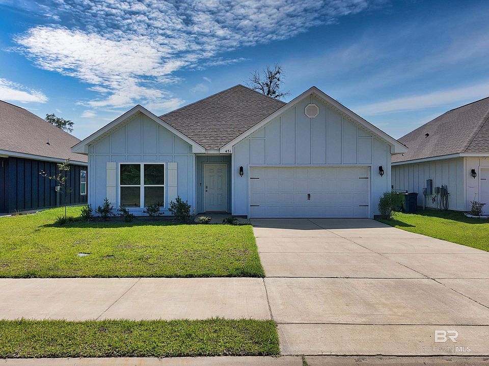 Welcome to the beach! This adorable New Construction Coastal Cottage is Gold Fortified and sits Lakefront in this popular subdivision! The Rhett floor plan is a popular plan offering 4bdrms/2bth, double car garage, spacious entry, w/ light wood look laminate throughout, custom painted cabinets in baths and kitchen offering plenty of storage space and large enough for entertaining, SS appliances, Granite countertops throughout, Brushed Nickel finishes, large guest bedrooms, Primary Bedroom offers a lakeview, Double vanities, garden tub and separate shower in Primary Bath, Private covered back porch w/ lakeviews, security system installed w/ cameras. This plan has it all is the best priced lakefront home in the Subd! Aventura Subd offers its owners a beautiful community pool, fire pit area and several playgrounds for your enjoyment! Be sure and check out this virtual tour!https://view.ricoh360.com/0c025cc1-e239-4677-918e-3b0a8ca78b36?type=compact Buyer to verify all information during due diligence.